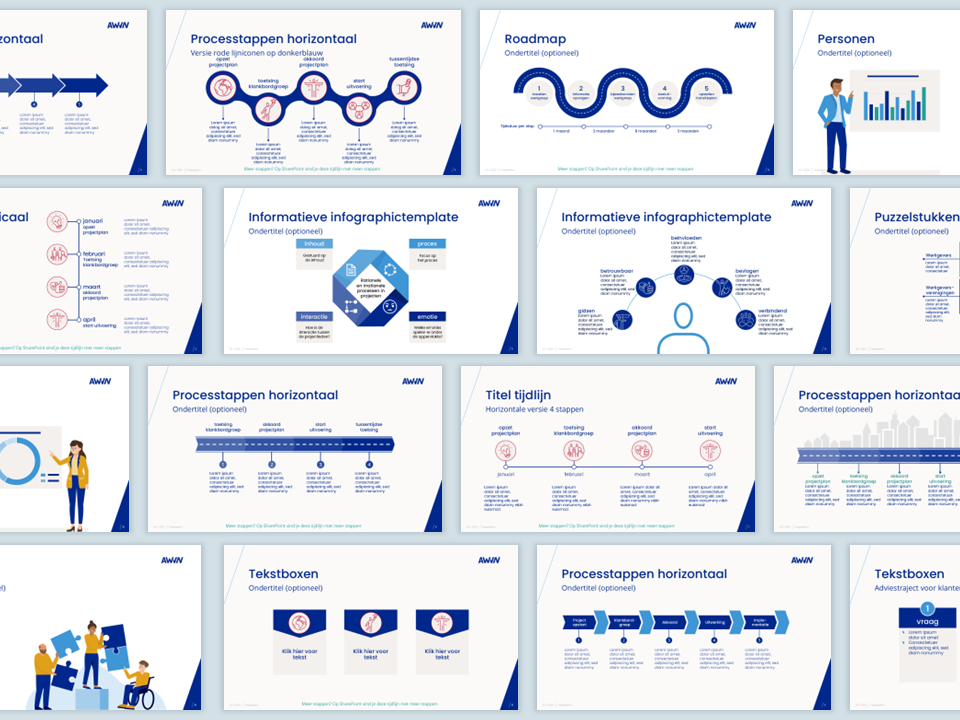 Want in de sjablonen staan titels, teksten en vormen direct in de goede kleur en huisstijl. Met een professionele uitstraling die past bij de organisatie.